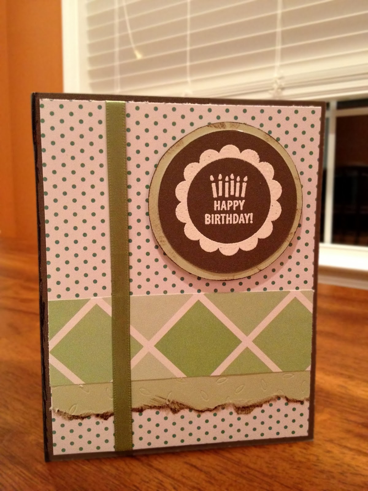 The dry embossing on the lighter green strip toward the bottom was pretty much a waste of my time. {lesson learned} But I think the wet embossing of the Happy Birthday circle design gives it a bit of texture & shine. I also put the 3D glue dots under that, which gave some dimension to the front.